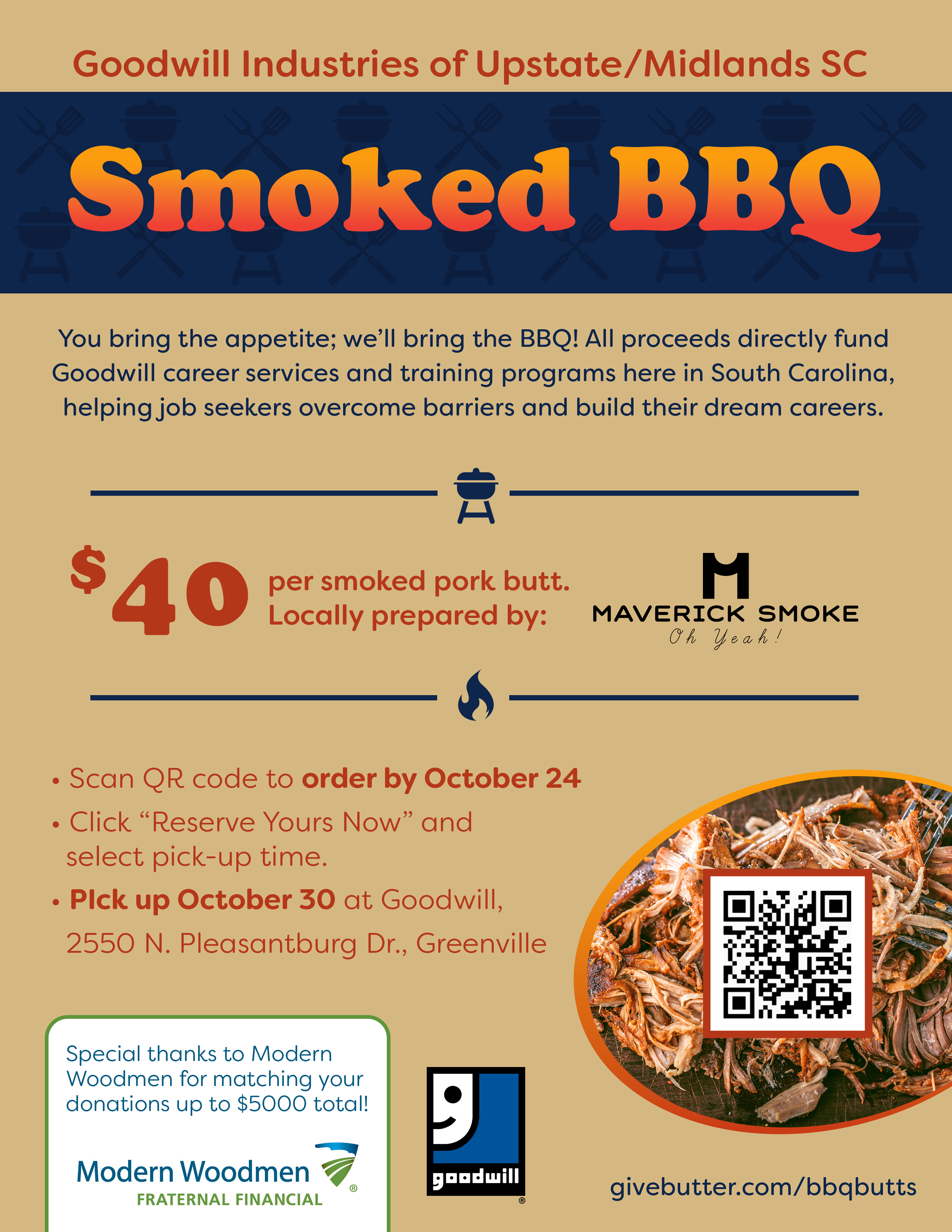 Pre-order a $40 smoked pork butt from Goodwill's BBQ Sale! Every delicious bite directly funds careeer services and job training for South Carolinians, empowering them to find work and build sustainable lives.