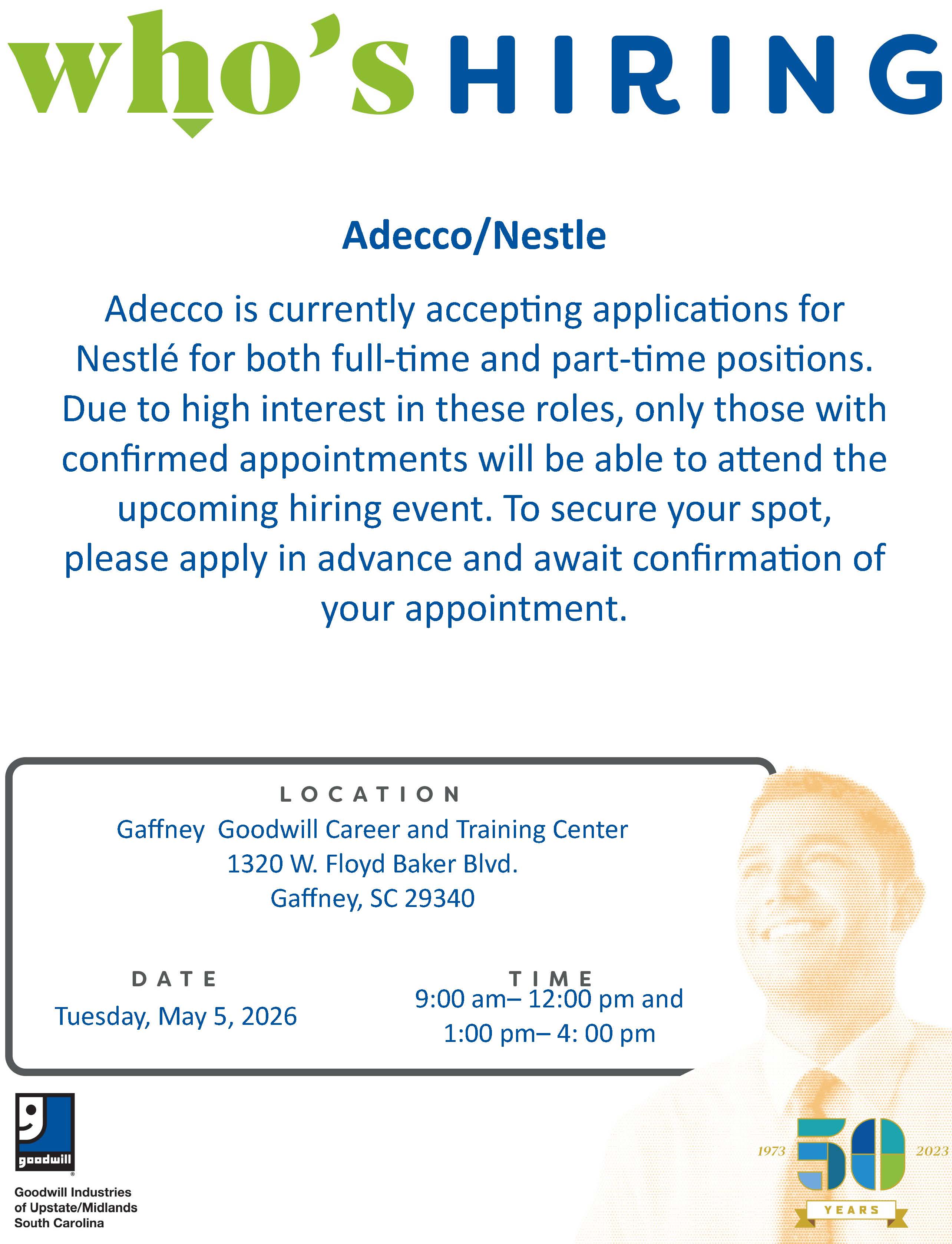 Goodwill Hosts Hiring Event for Adecco/Nestle in Gaffney