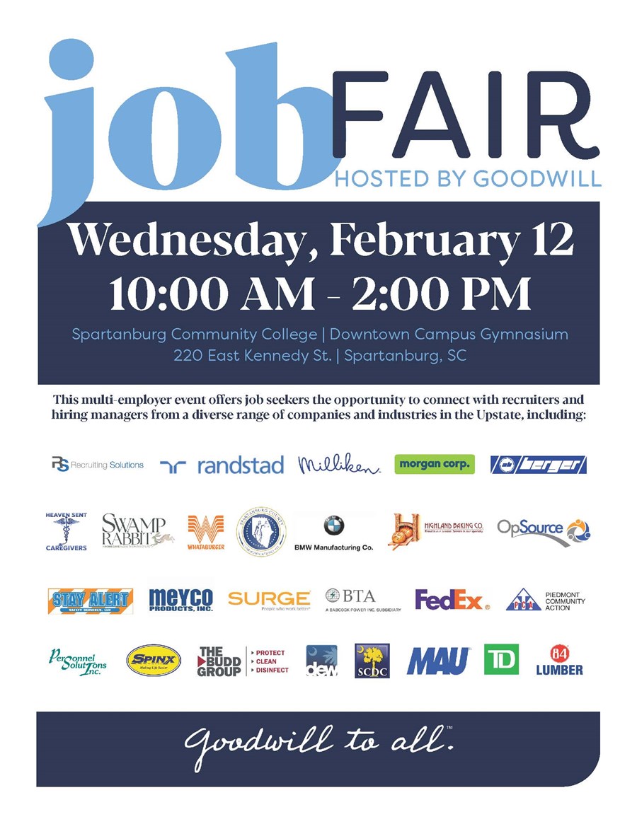 Goodwill Industries of Upstate/Midlands South Carolina (GIUMSC) is hosting a multi-employer job fair in Spartanburg on February 12, 2025. This event, designed to connect career seekers with recruiters and hiring managers, will feature employers across high-demand industries, including logistics, healthcare, food service, manufacturing, and corrections.